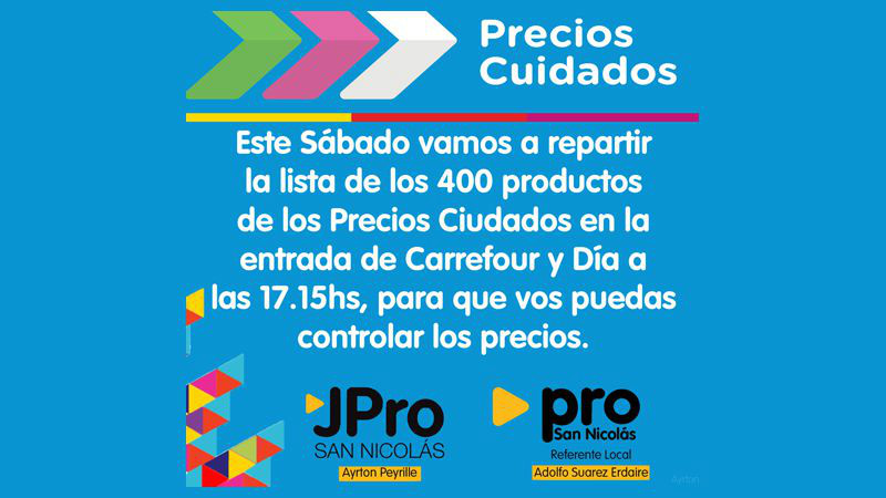 El sábado 14 de mayo a las 17.15, voluntarios y equipo de juventud PRO Cambiemos junto al Director de la Oficina de Desarrollo Social de San Nicolás y Ramallo Dr. Adolfo Suárez Erdaire y referente local del Pro (Propuesta Republicana) estarán en la entrada del Carrefour de calle Mitre y en el supermercado Día de calle Pellegrini repartiendo la lista oficial de los Precios Cuidados, donde se encuentran mas de 400 productos, detallando la marca, unidad, código EAN y precio, así los consumidores podrán ir a dichos comercios y controlar que el mismo cumpla con los precios oficiales, a su vez se va detallar un numero telefónico para poder denunciar faltantes o irregularidades.