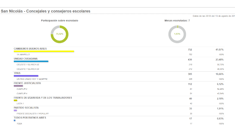 Se van conociendo los primeros datos oficiales de las mesas escrutadas en la ciudad de San Nicolás, luego de que haya votado el 75,52 por ciento de los electores.