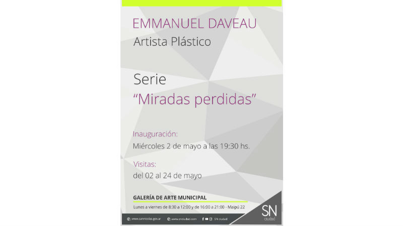 “Miradas perdidas” es una producción del artista plástico Emanuel Daveau y estará en exposición hasta el martes 22 de mayo de 2018, a las 20:00 hs. Los días y horarios en los que la galería estará abierta al público serán: de Lunes a viernes de 8:30 a 12:00 y de 16:00 a 21:00 en Maipú 22.