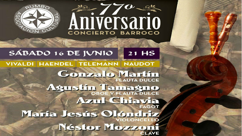 El próximo 12 de junio Rumbo cumplirá 77 años y lo festejará en su Salón Auditorio el sábado 16 de junio a las 21 horas con un concierto Barroco con música de Vivaldi, Haendel, Telemann y Naudot.