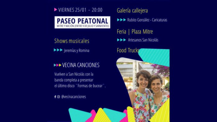 El viernes 25 de enero a partir de las 20 hs., las calles Nación y Mitre entre 9 de julio y Sarmiento serán el lugar de encuentro de la Estación “Paseo Peatonal”. Allí, los nicoleños disfrutaremos de shows musicales con la banda “Vecina Canciones” presentando su último disco “Formas de bucear”. Además, Jeremías y Romina estarán mostrando lo mejor de su música.