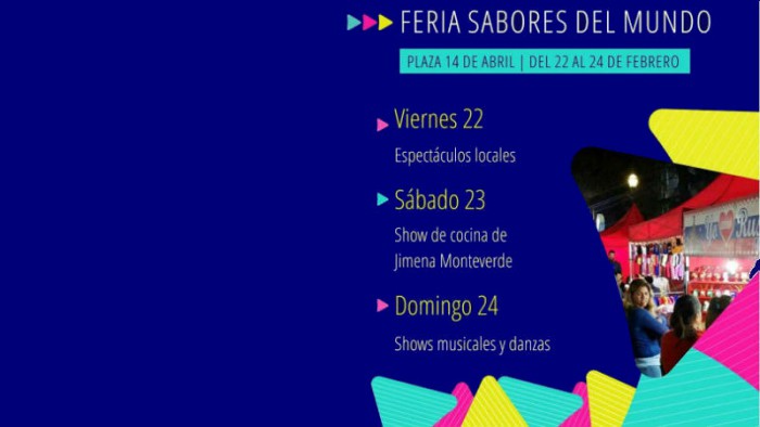 Los próximos viernes 22, sábado 23 y domingo 24, la ya clásica “Sabores del Mundo” se instalará en la Plaza 14 de Abril de 10.30 a 00:00 con alrededor de 40 stands, 130 puestos de artesanos, shows en vivo de la carismática cocinera Jimena Monteverde, Federico Murray Zumba y juegos para los más chicos.