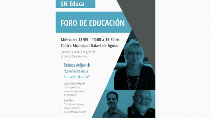 El miércoles 18 de septiembre de 13 a 15:30 hs. se realizará el foro SN Educa en el Teatro Municipal “Rafael de Aguiar”. El evento no requiere inscripción previa, con entrada libre y gratuita y está destinado a docentes y al público en general que quiera participar de este foro que tendrá tres disertantes.