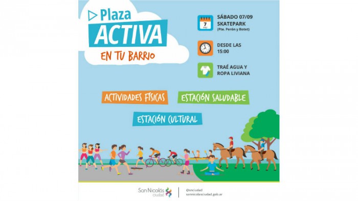 El sábado 7 de septiembre a partir las 15 hs. se desarrollará el Programa “Plaza Activa en tu Barrio” con actividades deportivas y recreativas para disfrutar en familia, en el SN Skatepark, ubicado en Pte. Perón y Botet.