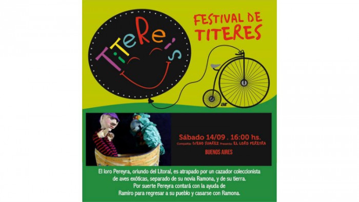 El sábado 14 de septiembre a las 16 hs., en el marco del Festival de Títeres “Titereís”, se presentará la obra “El loro Pereyra”, a cargo de la Compañía Diego Suárez, de Buenos Aires.