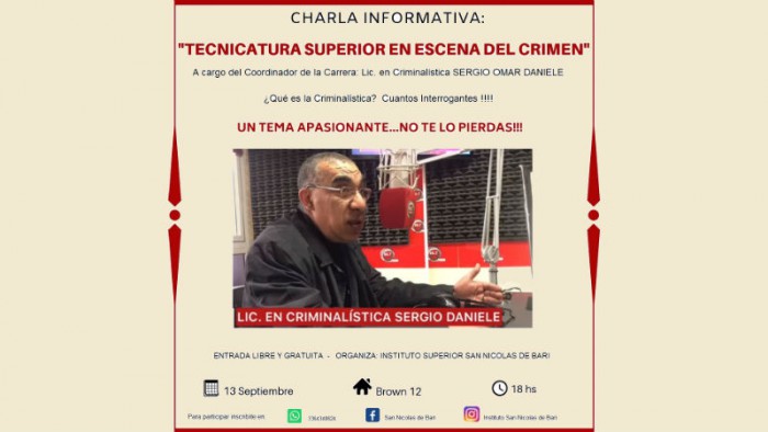 El próximo viernes 13 de septiembre a las 18 horas se realizará en Brown 12, la charla informativa a cargo del coordinador de la carrera, Sergio Daniele; Licenciado en Criminalística con 27 años de experiencia en el tema.