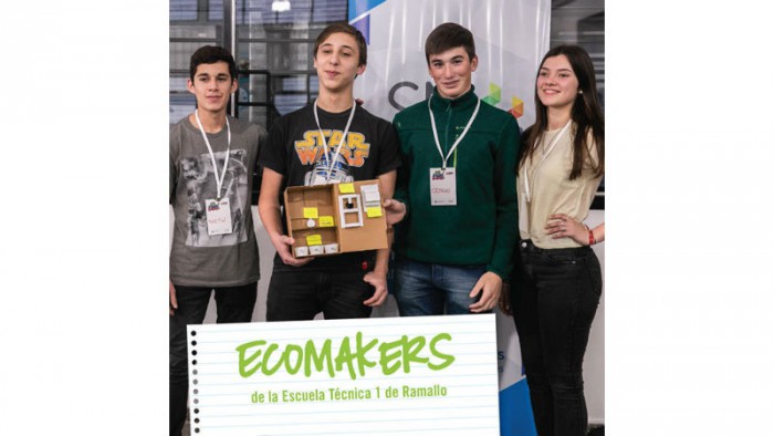 2- EcoMakers (Conrado Fabrico, Violeta Perie, Martín Cardozo, Octavio Oña, alumnos de la Escuela Técnica 1 de Ramallo--> Ecomakers consiste en un sistema de selección de productos para reciclaje derivados del acero, plásticos y aluminio, a través de unas bocas de recolección dispuestas en zonas estratégicas, y a partir del cual se otorgaría un sistema de puntajes que otorgan beneficios en distintos locales asociados.