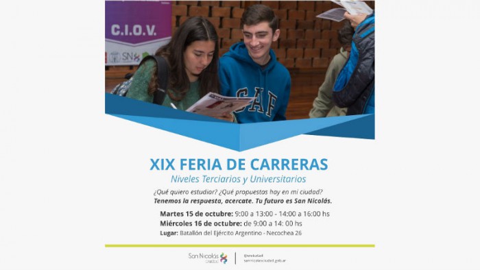 Se podrá visitar la Feria para informarse sobre la oferta educativa disponible en San Nicolás y las herramientas que brinda el CIOV para ayudar en la elección. Además, distintos profesionales contarán sus experiencias en el ámbito laboral y académico.