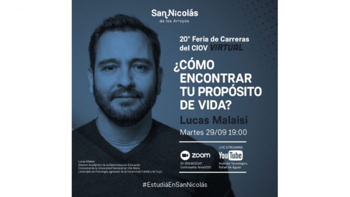 Dentro de las actividades programadas por la 20° Feria de Carreras que organizan la Municipalidad de San Nicolás y el CIOV, el martes 29 de septiembre a las 19 hs. se ofrecerá la charla denominada “¿Cómo encontrar tu propósito de vida?” a cargo de Lucas Malaisi.