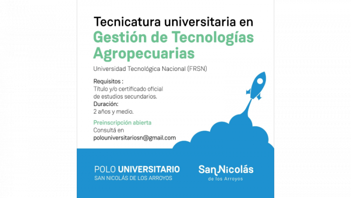 El Polo Universitario San Nicolás y la UTN lanzan una nueva carrera: la Tecnicatura Universitaria en Gestión de Tecnologías Agropecuarias, que comenzará a desarrollarse a partir de marzo del año próximo.