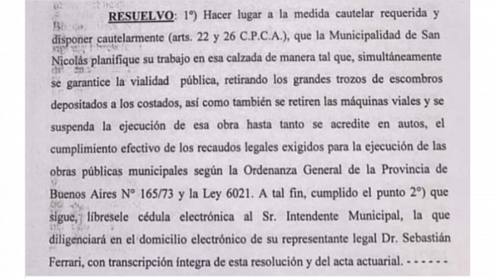 La Jueza en lo Contencioso y Administrativo, Dra. María Isabel Fulgheri, resolvió "hacer lugar a la medida cautelar requerida por la empresa Moviport y disponer cautelarmente que la Municipalidad de San Nicolás planifique su trabajo en esa calzada de manera tal que, simultáneamente, se garantice la vialidad pública, retirando los grandes trozos de escombros depositados a los costados, así como también se retiren las máquinas viales y se suspenda la ejecución de esa obra hasta tanto se acredite en autos...".
