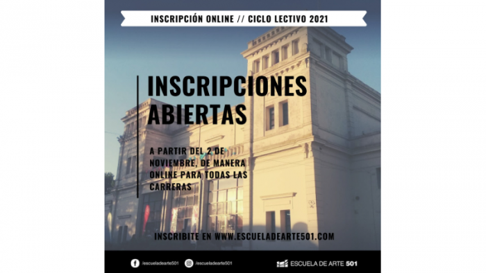 Este año, y debido a las medidas de prevención frente al avance del COVID-19, las inscripciones para el ciclo lectivo 2021 se realizarán de manera online, por medio de formularios que se encuentran en el sitio web www.escueladearte501.com