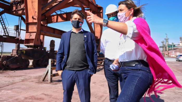 En su visita a San Nicolás, el gobernador de la provincia de Buenos Aires, Axel Kicillof, recorrió las instalaciones del Puerto local, acompañado por la presidenta del consorcio de Gestión del mismo, Cecilia Comerio.