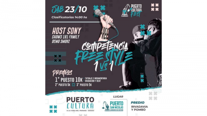 La tarde del sábado será a puro rap. Todas las familias están invitadas al predio recuperado por el Puerto de San Nicolás (Rivadavia y Pombo) a partir de las 14 horas para disfrutar de las batallas en un gran escenario.