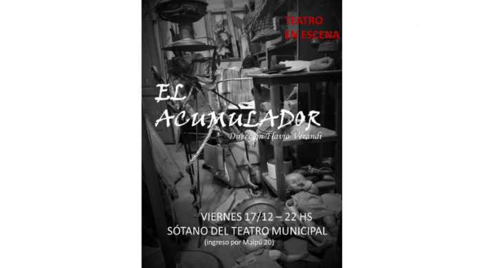 “El acumulador”, obra escrita y dirigida por Flavio Verandi, tendrá su estreno este viernes 17 de diciembre, con doble función – a las 20.30 y 22.00 hs- en el sótano del Teatro Municipal (ingreso por Maipú 20), junto a las actuaciones de Lorena Mendoza, Juan Luciano, Lucas Melling y Hernán Lattanzio.