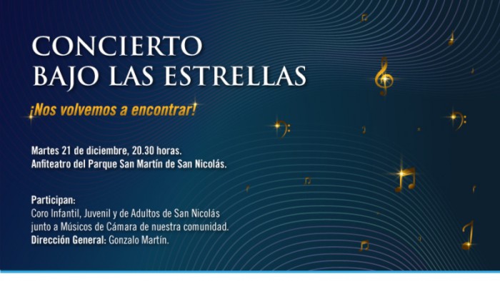 El próximo martes 21 de diciembre a las 20:30 hs. tendrá lugar en el anfiteatro del Parque San Martín de nuestra ciudad, el “Concierto bajo las Estrellas”, con la organización de Fundación PROA, la Subsecretaría de Cultura de la Municipalidad de San Nicolás y la Asociación Cultural Rumbo, promovido por la empresa Ternium.