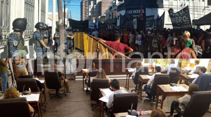 Desde muy temprano las puertas del Concejo Deliberante están custodiadas por las fuerzas de seguridad. Para este jueves se convocó a Asamblea de mayores contribuyentes y concejales para tratar el proyecto de ordenanza Fiscal y Tarifaria que contempla un aumento del 23% en las tasas municipales con ajustes trimestrales del 9%.