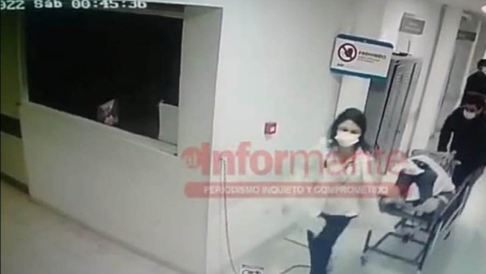 Diario El informante accedió en exclusiva a un video donde se lo ve al hombre sospechado de ser responsable de la muerte de tres de sus familiares, en los pasillos del Hospital San Felipe, mientras sacan del box a su madre tras un llamado de el avisando que se descompensó de repente.