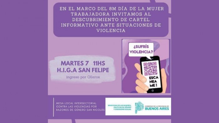 La Mesa Local Intersectorial contra las Violencias por Razones de Género San Nicolás y la Dirección de Región Segundo del MMGyDS invitan al descubrimiento del cartel informativo en el Hospital San Felipe en el marco del Día de la Mujer.