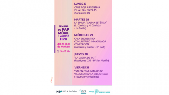 Dicha semana de PAP MÓVIL y vacunación contra HPV se complementa con el trabajo que viene realizando el SAPS desde hace un año con las jornadas de Viernes de mujer, donde se realizan controles ginecológicos, de embarazo y testeos de HIV/ Sífilis en distintos barrios de San Nicolás.