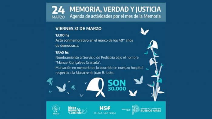 El día viernes 31 de marzo a las 13hs se llevará a cabo un acto en el Hall de ingreso por Avda Moreno y posteriormente se dará lugar al descubrimiento de una placa para renombrar al Servicio de Pediatría. El motivo del mismo es la marcación de un espacio para la memoria sobre lo sucedido en nuestro hospital durante la última dictadura cívico-militar.