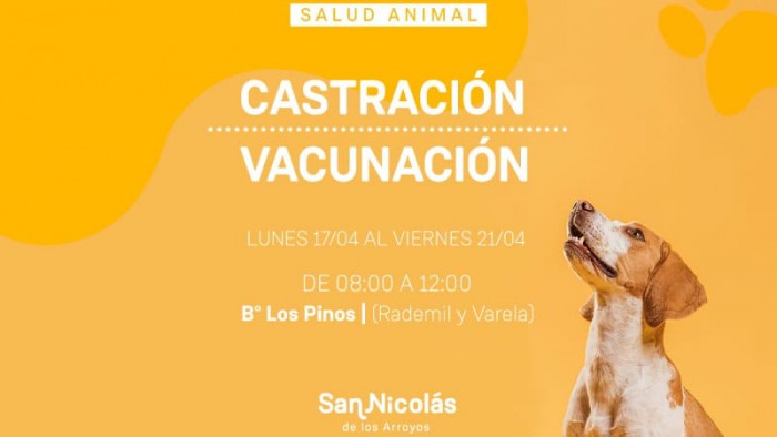 La Municipalidad de San Nicolás recuerda que hasta el viernes 21 de abril, el tráiler de castración y vacunación de la Municipalidad se encuentra de 8:00 a 12:00 en el salón comunitario de barrio Los Pinos, ubicado en Rademil y Varela. De esta manera todos los vecinos de la zona pueden acceder a ambos servicios de manera gratuita.
