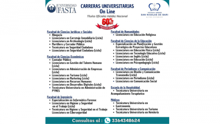 Higiene y Seguridad en el Trabajo, Martillero y Corredor Público, Abogacía, Seguridad Ciudadana, Inglés, la Licenciatura en Educación, Educación Física, Contador Público, Recursos Humanos, Turismo, Administración de Empresas, Administración de Pymes, Planificación y Gestión Estratégica de Proyectos Educativos, Marketing, Periodismo, y, Educación Religiosa.