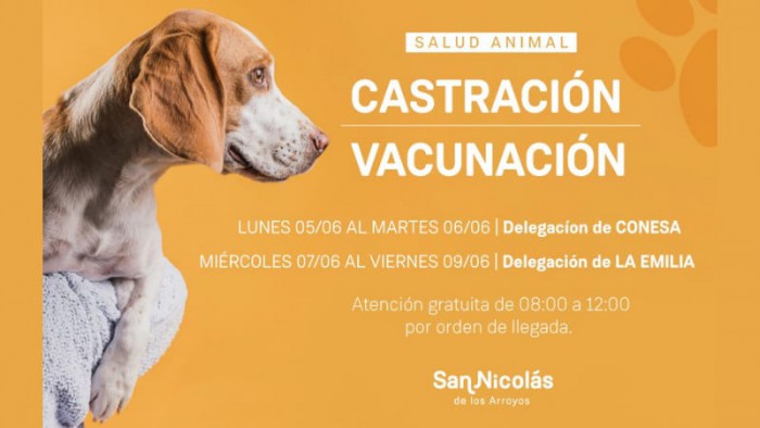 La Municipalidad de San Nicolás brindará el servicio de castración y vacunación los días lunes 5 y martes 6 en la Delegación de Conesa y los días miércoles 7, jueves 8 y viernes 9 en la Delegación de La Emilia, en el horario de 8:00 a 12:00.