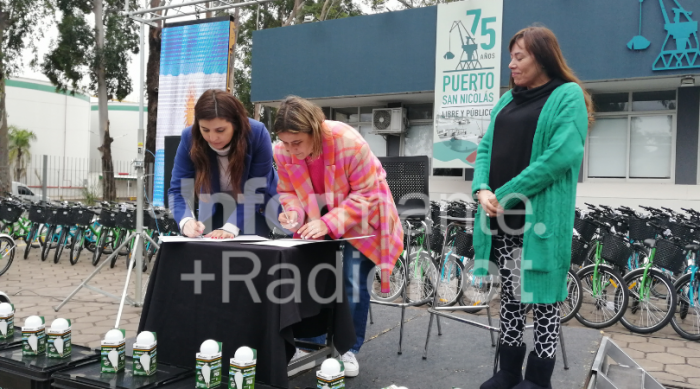 La presidenta del Consorcio de Gestión del Puerto de San Nicolás y precandidata a intendenta, Cecilia Comerio, y la ministra de Ambiente, Daniela Vilar, entregaron esta mediodía más de 200 bicicletas a estudiantes que idearon y llevaron adelante distintas iniciativas en el marco de un Proyecto de Movilidad Sustentable para la ciudad, que organizó la cartera ambiental.