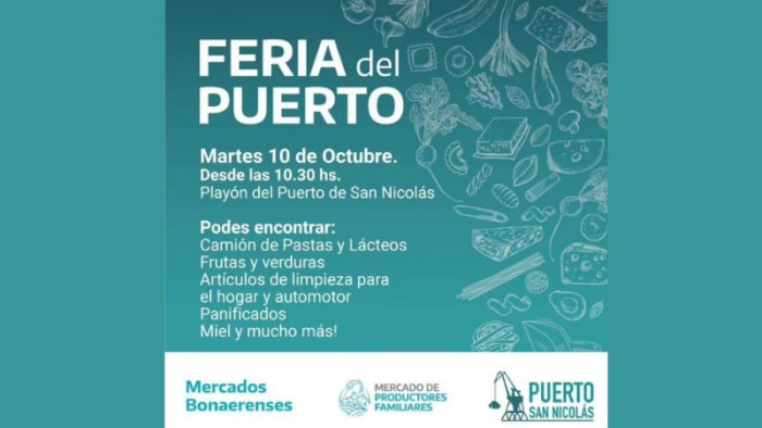 Este martes 10 octubre a partir de las 10hs (hasta agotar stock) se llevará a cabo la “Feria del Puerto”, en el Puerto de San Nicolás. La actividad se desarrollará en el playón de estacionamiento, Avda. Román Subiza y Bogado.