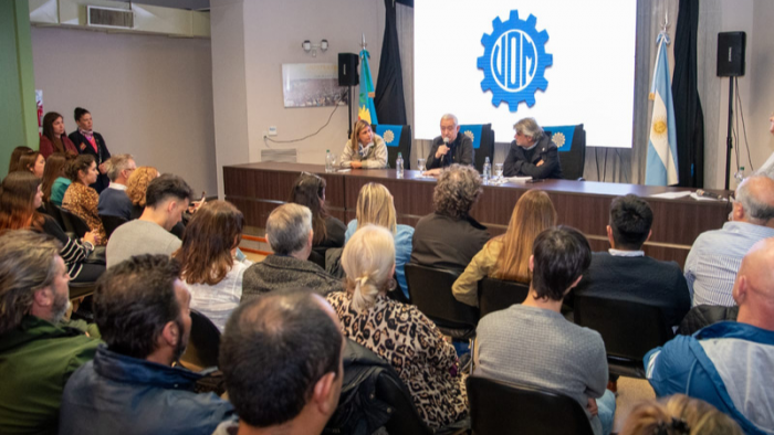 La presidenta del Consorcio de Gestión del Puerto de San Nicolás y candidata a intendenta, Cecilia Comerio, el ministro de Trabajo de la Provincia, Walter Correa, y el secretario nacional adjunto de la UOM, Naldo Brunelli, encabezaron esta tarde el encuentro "Los derechos de los trabajadores ante los avances de la derecha. Desafíos de la organización sindical", que se realizó Salón Auditorio del gremio de los metalúrgicos.