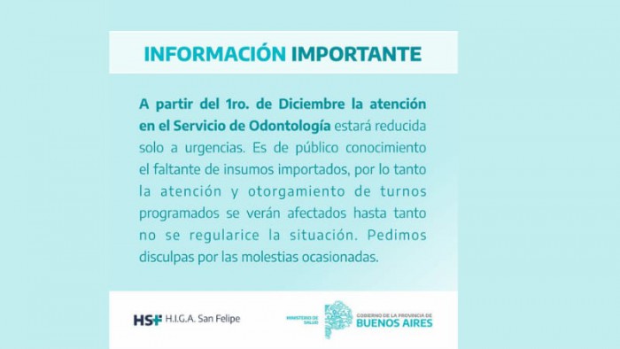 El Hospital San Felipe comunicó que a partir del 1 de diciembre la atención en el Servicio de Odontología estará reducido solo a urgencias por falta de insumos importados.