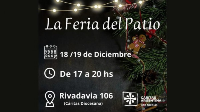El próximo lunes 18 y martes 19 de diciembre, de 17 a 20 hs, se llevará a cabo la última Feria del Patio 2023 en Rivadavia 106, Cáritas Diocesana.
