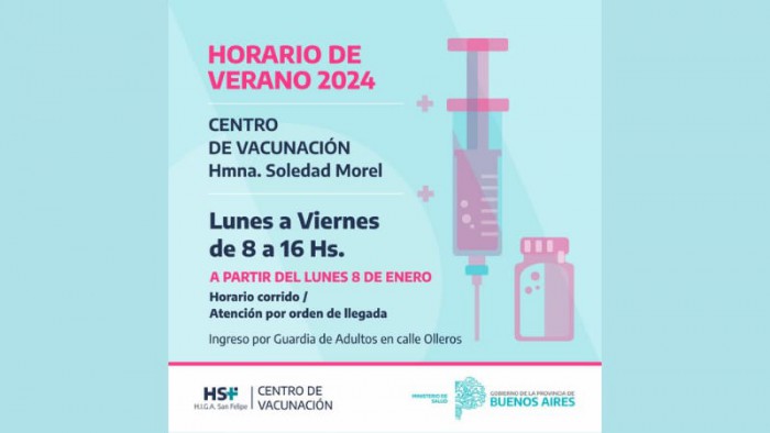 Desde el 8 de enero el vacunatorio comenzará a funcionar de lunes a viernes de 8:00 a 16:00hs. La atención es por orden de llegada, sin turno previo.