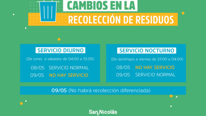 La Municipalidad de San Nicolás informa que, debido al paro general del jueves 9 de mayo, se aplicarán cambios en la recolección de residuos sólidos urbanos. Se pide a los vecinos que, atendiendo los días y horarios del servicio, cuiden de la limpieza de la vía pública.