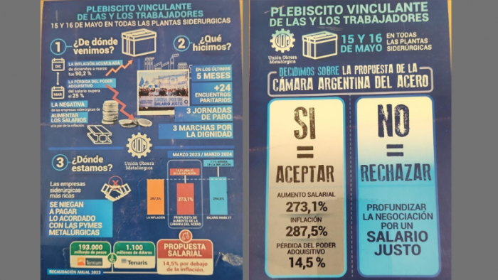 “Después de cinco meses infructuosos, el secretariado nacional decide enviar la propuesta de la Cámara Argentina del Acero a un plebiscito con los trabajadores y ellos determinarán si aceptan esta propuesta o no y saber cómo se continúa”.