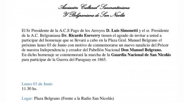 La ceremonia fue organizada por D. Luis Simonetti, presidente de la A.C Sanmartiniana Pago de los Arroyos y por el Dr. Ricardo Eseverry, presidente de la A.C Belgraniana, quienes invitan a la comunidad a participar del homenaje.