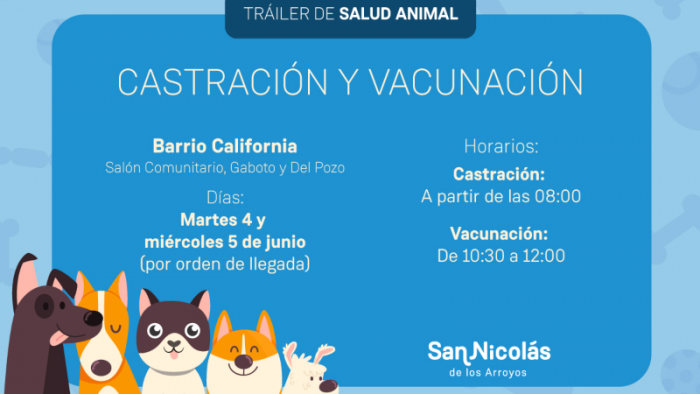 Los días martes 4 y miércoles 5 de junio, el tráiler de castración y vacunación de la Municipalidad se encontrará brindando el servicio en el salón comunitario de barrio California, ubicado en Gaboto 1353 (esquina Del Pozo).