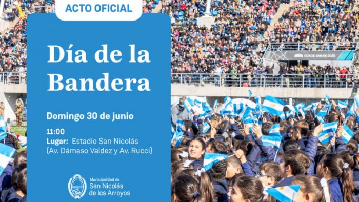 El domingo 30 de junio a las 11:00 en el Estadio San Nicolás se realizará el acto oficial por el Día de la Bandera, en conmemoración de un nuevo aniversario del paso a la inmortalidad del Gral. Manuel Belgrano.