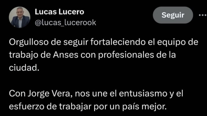 "Orgulloso de seguir fortaleciendo el equipo de trabajo de Anses con profesionales de la ciudad. Con Jorge Vera, nos une el entusiasmo y el esfuerzo de trabajar por un país mejor", posteó en sus redes Lucas Lucero.