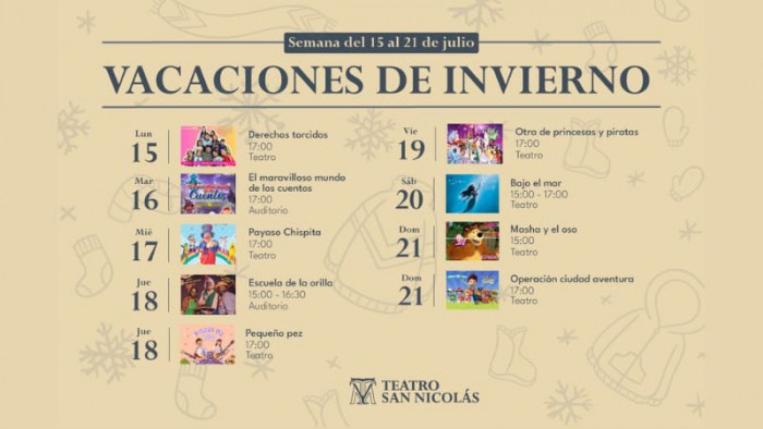 El Teatro San Nicolás presenta su cartelera para la primera semana del receso escolar con diversos espectáculos. Las funciones comienzan este lunes 15 de julio y hay opciones durante todos los días de las vacaciones de invierno.