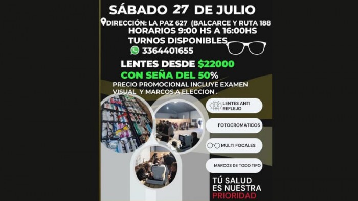 Se ofrecerán lentes desde $22.000 con seña de 50%. El precio promocional incluye examen visual y marcos a elección.
