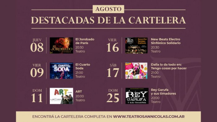 La cartelera del mes de agosto llega renovada con música, teatro y comedia que se unen para que los nicoleños disfruten de cada fin de semana con espectáculos para todos los gustos.