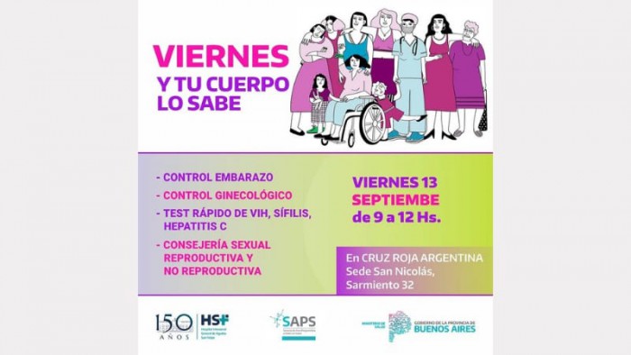 Este viernes 13 de septiembre, personal del Hospital San Felipe estará realizando controles ginecológicos, de embarazo, test rápidos de Hepatitis C, VIH y Sífilis, y consejería sexual, reproductiva y no reproductiva en la sede de la Cruz Roja (Sarmiento 32).