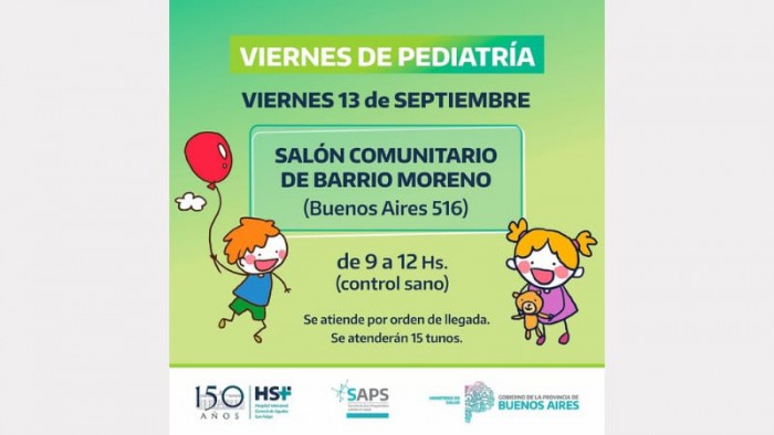 Por otro lado, en el Salón Comunitario de barrio Moreno, ubicado en Buenos Aires 516, se instalará el personal de Pediatría para realizar controles de 9:00 hs a 12:00 hs.