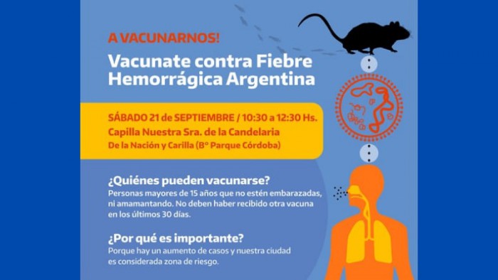 El Hospital San Felipe informa que este sábado 21 de septiembre estarán vacunando contra la Fiebre Hemorrágica Argentina en la Capilla Nuestra Sra. de la Candelaria, ubicada en De la Nación y Carilla.