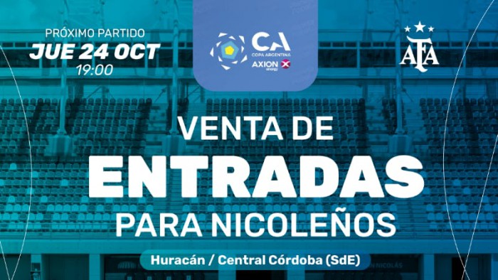 Este jueves 24 de octubre de 10:00 a 18:00 estará habilitada la venta de entradas exclusiva para nicoleños para la primera semifinal de la Copa Argentina entre Huracán y Central Córdoba de Santiago del Estero que se disputará en el Estadio San Nicolás.