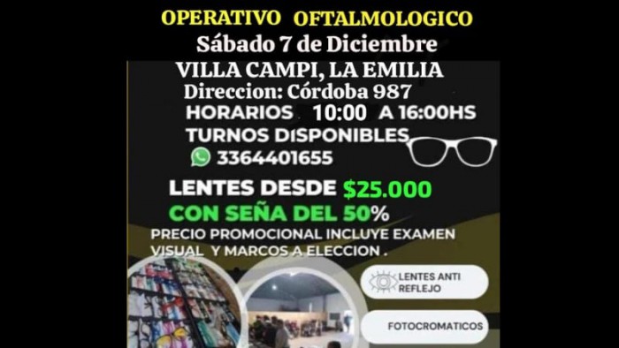 Se ofrecerán lentes desde $25.000 con seña del 50%. El precio promocional incluye examen visual y marcos a elección.