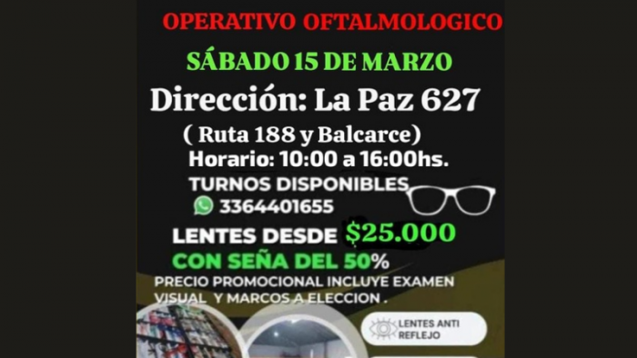 El sábado 15 de marzo, de 10.00 a 16.00 horas, se desarrollarán en la calle La Paz 627, entre Ruta 188 y Balcarce, las pruebas de test visual gratuitas y trámites de cristales a precios accesibles.