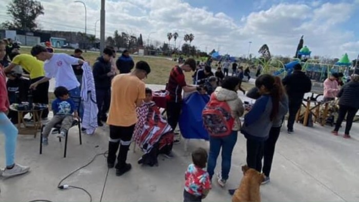 En horas de la tarde de este domingo, un grupo de amigos se unió para llevar a cabo una obra solidaria en la plaza de barrio Avambaé, donde estuvieron realizando cortes de pelos a niños a cambio de alimentos no perecederos.